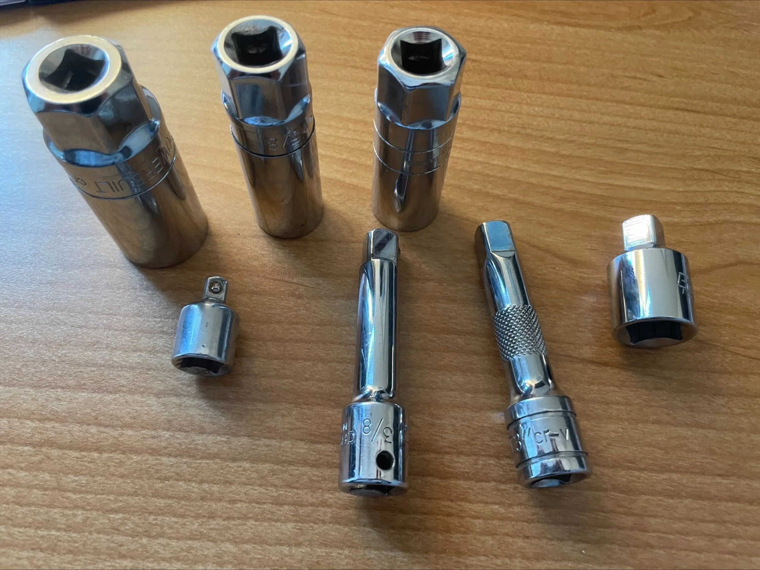 3/8ths extension (x2); 13/16ths long socket; 5/8ths long socket (x2); 1/4-3/8ths adapter; 3/8ths-1/2 adapter.